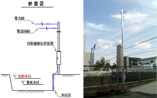 水位面があらかじめ設定された通報位置まで上昇すると、自動的に樋門操作員、河川管理者等まで電話でお知らせします。